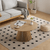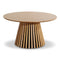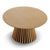Le plateau rond en placage de chêne donne un aspect doux et accueillant, tandis que le piétement à lattes distinctif ajoute une touche de modernité